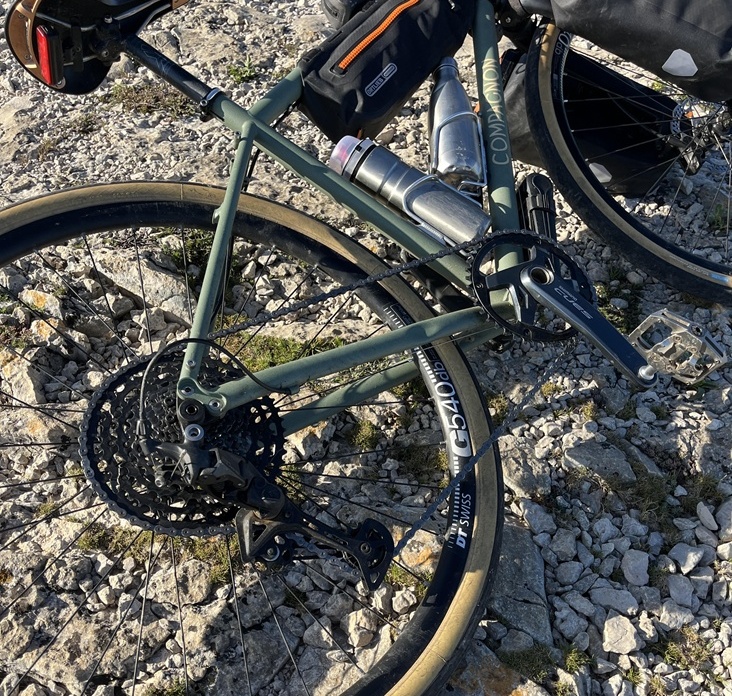 De notre côté chez Compagnon, notre règle est assez simple. Nous avons un cadre unique, commun à toutes nos configurations (randonneur, tout terrain, gravel) et homologué dans la norme la plus exigeante, l’ISO 4210 Mountain qui garantit une résistance aux terrains et conditions les plus difficiles. Notre cadre est fait d’acier Cromo 4130, avec une épaisseur des tubes différenciées sur le triangle avant : 0,6 mm renforcée à 0,9 mm aux extrémités, là où les contraintes sont les plus fortes. Le tube diagonal affiche un diamètre de 38 mm, garantissant rigidité et stabilité du vélo, même chargé, sans compromis sur le confort.
