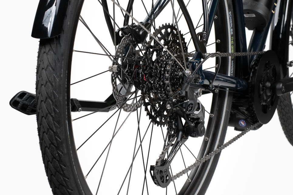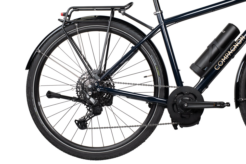 Notre Compagnon à assistance électrique est équipé d’une cassette 11V, d’un petit pignon en 11 dents et d’un grand pignon en 50 dents. Couplé à un pédalier en 40 dents, vous allez pouvoir mouliner à petite vitesse, gravir n’importe quel col, chargé à bloc. L’assistance sera là pour vous donner le coup de fouet nécessaire pour y arriver, sans suer. Mais si vous souhaitez quand même transpirer, désactiver l’assistance, vous grimperez quand même, sans (trop) vous fatiguer, car notre développement est conçu pour que arriviez à destination, en pédalant dans la semoule !
